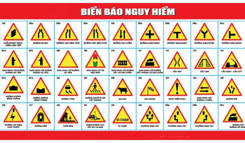 Nhóm biển báo nguy hiểm gồm 46 kiểu được đánh số thứ tự từ biển số 201 đến biển số 246.